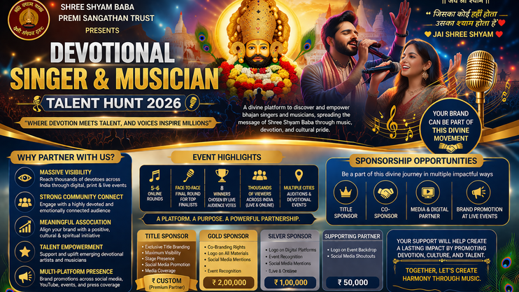 Supporting the Devotional Singer & Musician Talent Hunt 2026 organized by Shree Shyam Baba Premi Sangathan Trust is not just a sponsorship—it is an opportunity to be part of a global spiritual and cultural movement dedicated to devotion, music, and talent inspired by the blessings of Shree Shyam Baba.