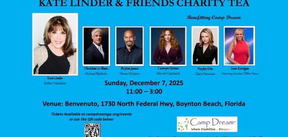 Join Kate Linder & Friends First Annual Charity Tea for Camp Dream in South Florida with Kate Linder, Christian Le Blanc, Bryton James, Camryn Grimes, Hayley Erin, and Sam Kerrigan, Morning Anchor CBS12 News. All proceeds go to Camp Dream.