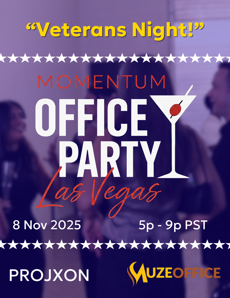 At PROJXON, we don’t just host events, we build ecosystems of purpose. The Momentum Office Party (MOP) is powered by a veteran-owned and operated team that believes in creating spaces where impact and opportunity meet. By sponsoring this event, you’re not just putting your logo on a banner — you’re aligning your brand with leadership, integrity, and service. You’re standing behind a community of veterans, entrepreneurs, and innovators who believe in collaboration over competition and connection over convenience. Here’s why your partnership matters: